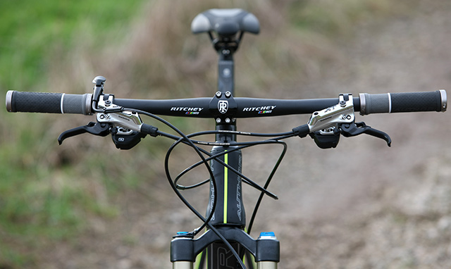 Když byla zmínka o Ritchey, tak musíme říct, že tahle značka na bike dodala řídítka a představec v hliníkové verzi nejvyšší řady WCS. Author je pak doplnil ještě vlastní karbonovou sedlovkou, sedlovou objímkou a gripy a za zmínku stojí i fakt, že ke kolu sériově dává také nášlapné pedály Shimano M540.