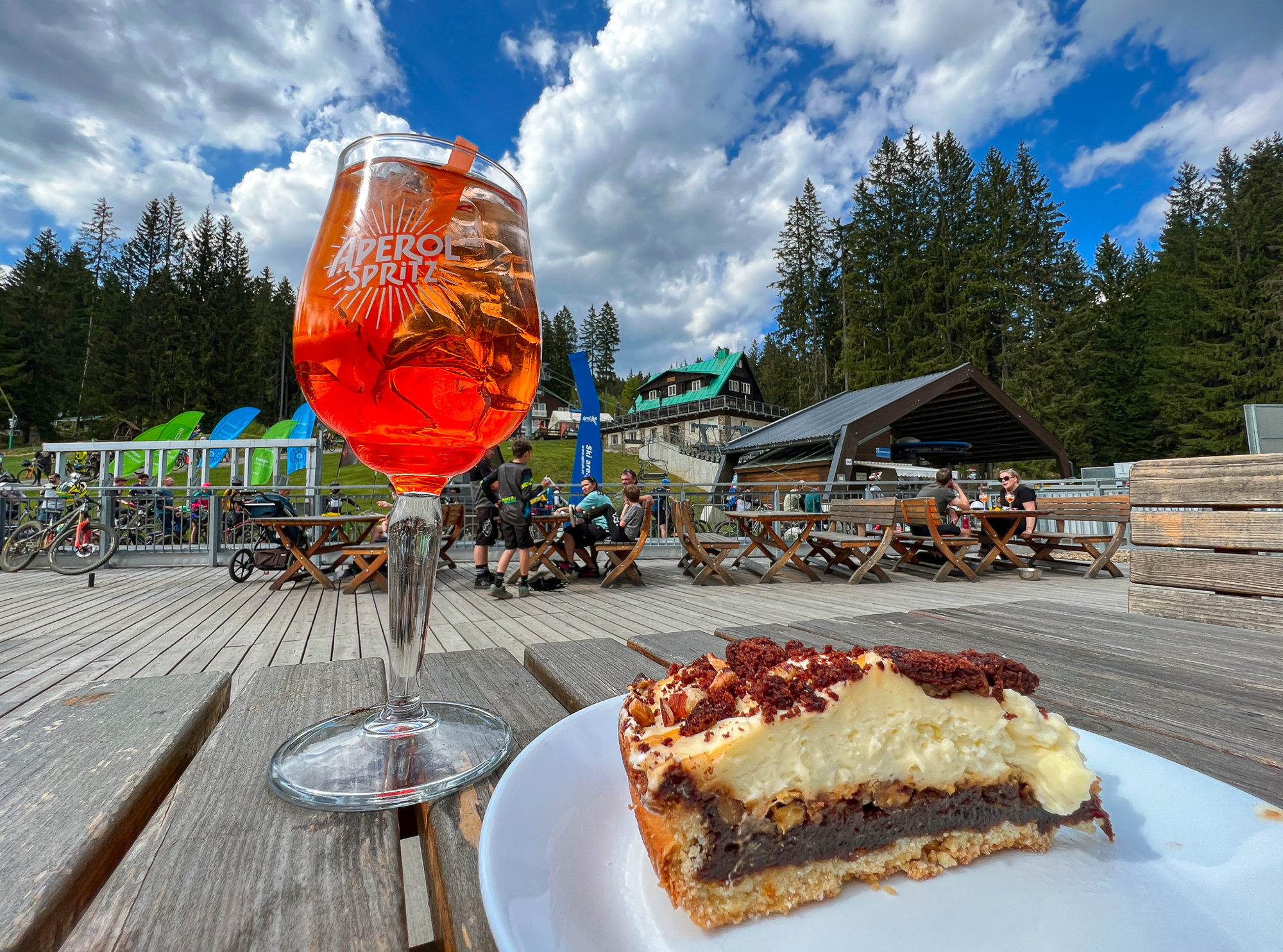 Na občerstvení se momentálně dá zajít do kiosku na vrcholu Špičáku nebo do restaurace U lanovky. Legendární Blaženka se otevře až s denním provozem areálu, tedy od 14.6. My se tu po ježdění odměnili dortíkem na terásce restaurace U Lanovky. Samozřejmě se tu dá i plnohodnotně naobědvat, denní nabídka se mění, ale dá se tu objednat například z pečeného bůčku, špenátu a bramborového knedlíku (225 Kč), kuřecí rolády se šťouchaným bramborem (225 Kč) nebo z domácích borůvkových knedlíků (205 Kč).