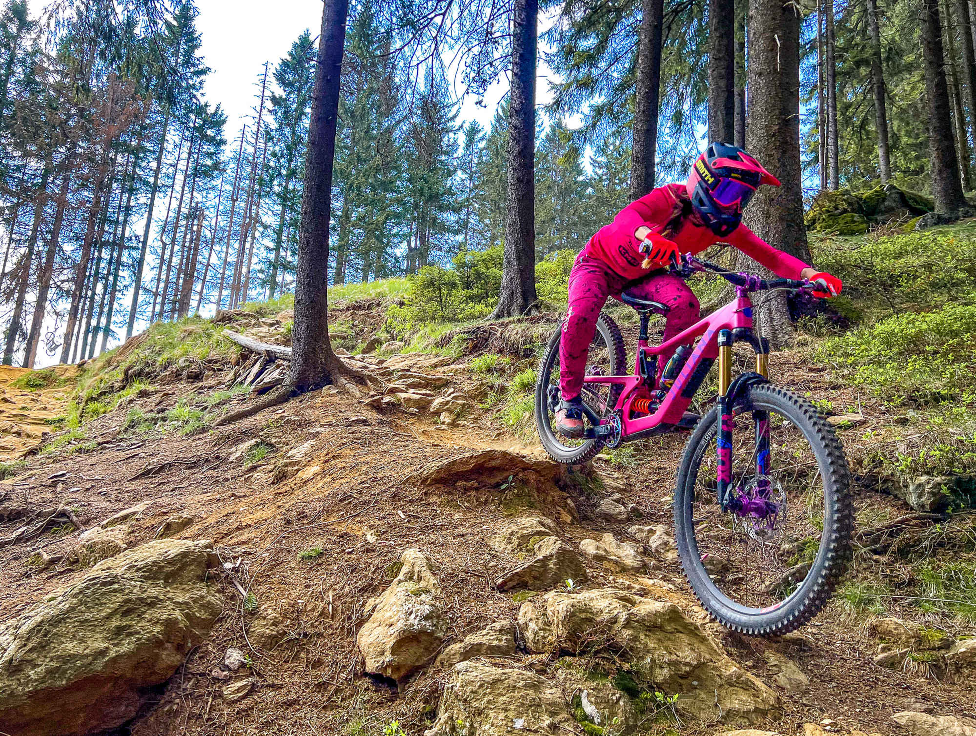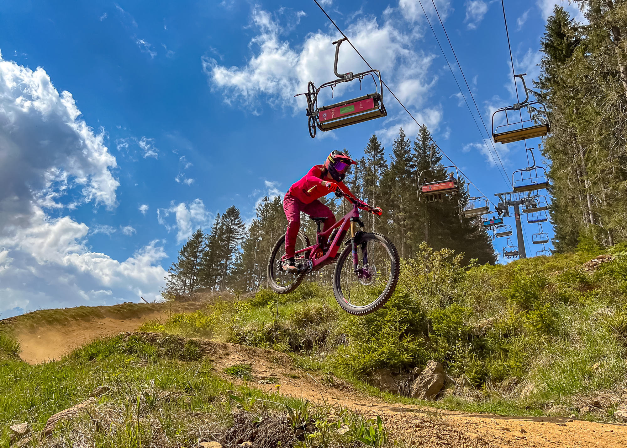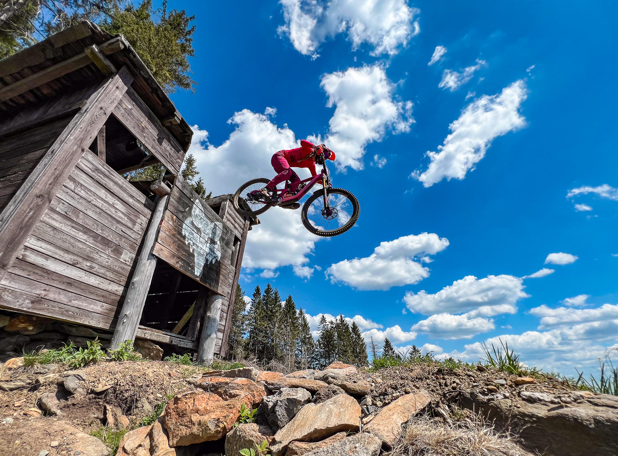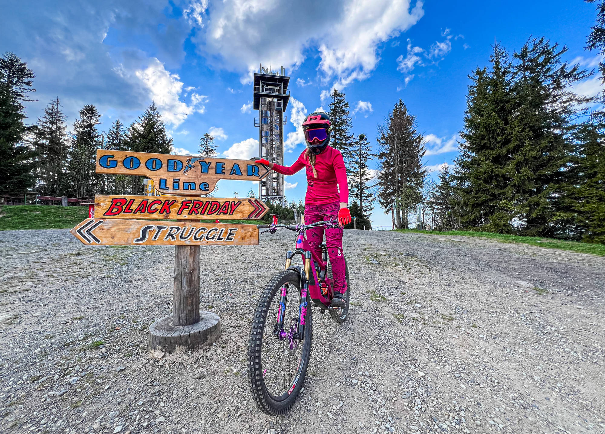 Kromě technické jízdy nabídne Struggle i několik solidních poletů. Ten první je hned krátce po úvodu a jde asi o největší skok na Špičáku. Loni se pak „znovu otevřel“ skok z boudy, který jsem skákala už před lety, nyní má ale trochu posunutý dopad, který je pro mě mnohem příjemnější a skáče se docela pohodlně. Abych jinak upřesnila „skok z boudy“, tak jde o starou startovní boudu pro lyžařské závody. Pokud to stihnete, určitě se odsud pokochejte krásným výhledem na železnorudskou kotlinu :-)