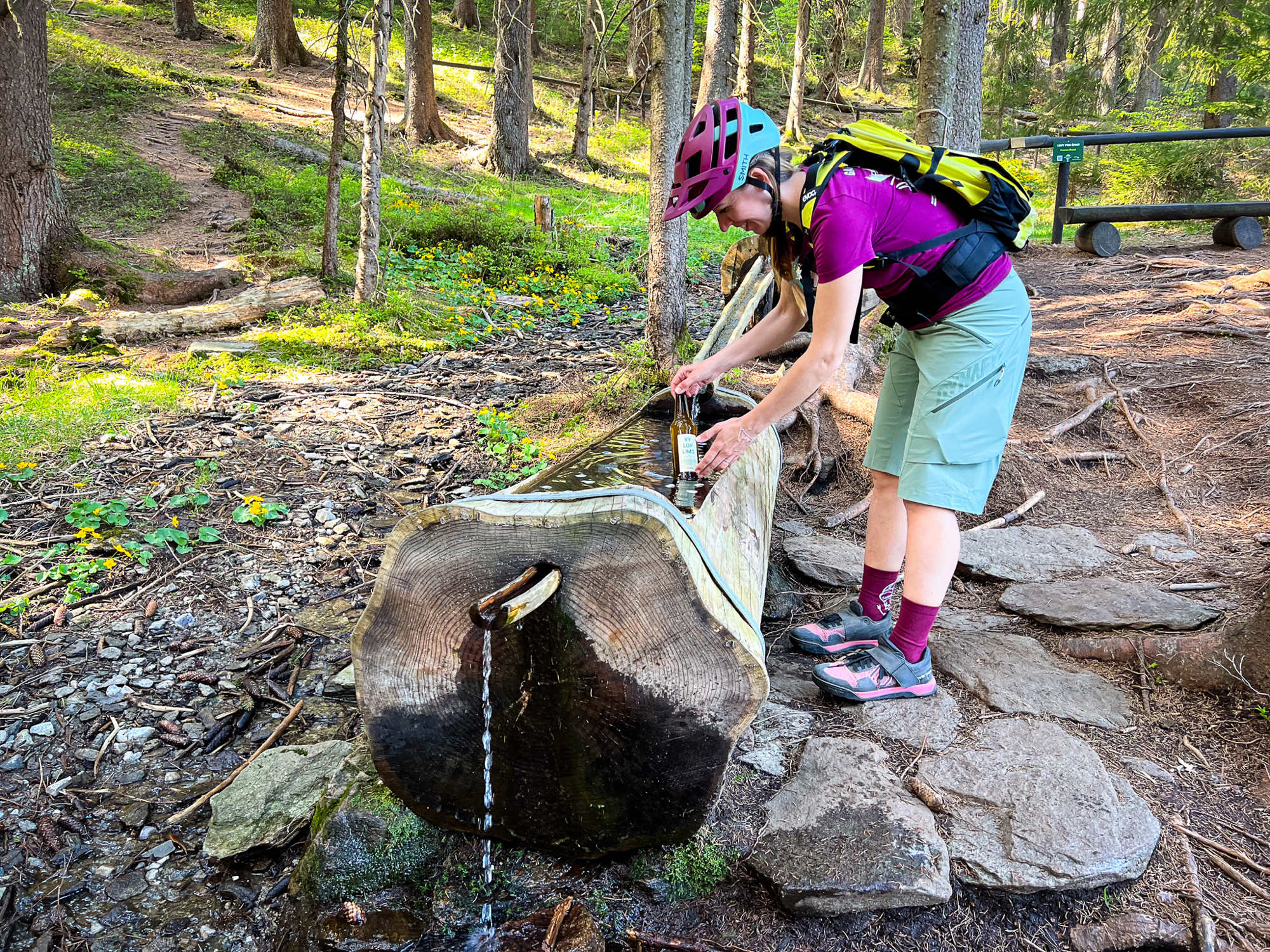 Z areálu Špičák jsme nejprve zamířili po cyklostezce směrem na Hofmanky, což je jediné významné stoupání na tomto okruhu. Z Hofmanek už to je jen nějaký kilometr z kopce dolů k prameni Řezné (významná řeka vlévající se do Dunaje), kde je vybudovaná přírodní „Osvěžovna“. V dřevěné vaně jsou tu vyskládané malinové a grepové limonády, které ochlazuje přímo pramen Řezné. Takhle přírodně ochlazená limča v srdci Šumavy vyjde na 45 Kč a zaplatit ji můžete hotovostí do kasičky nebo pomocí QR kódu.