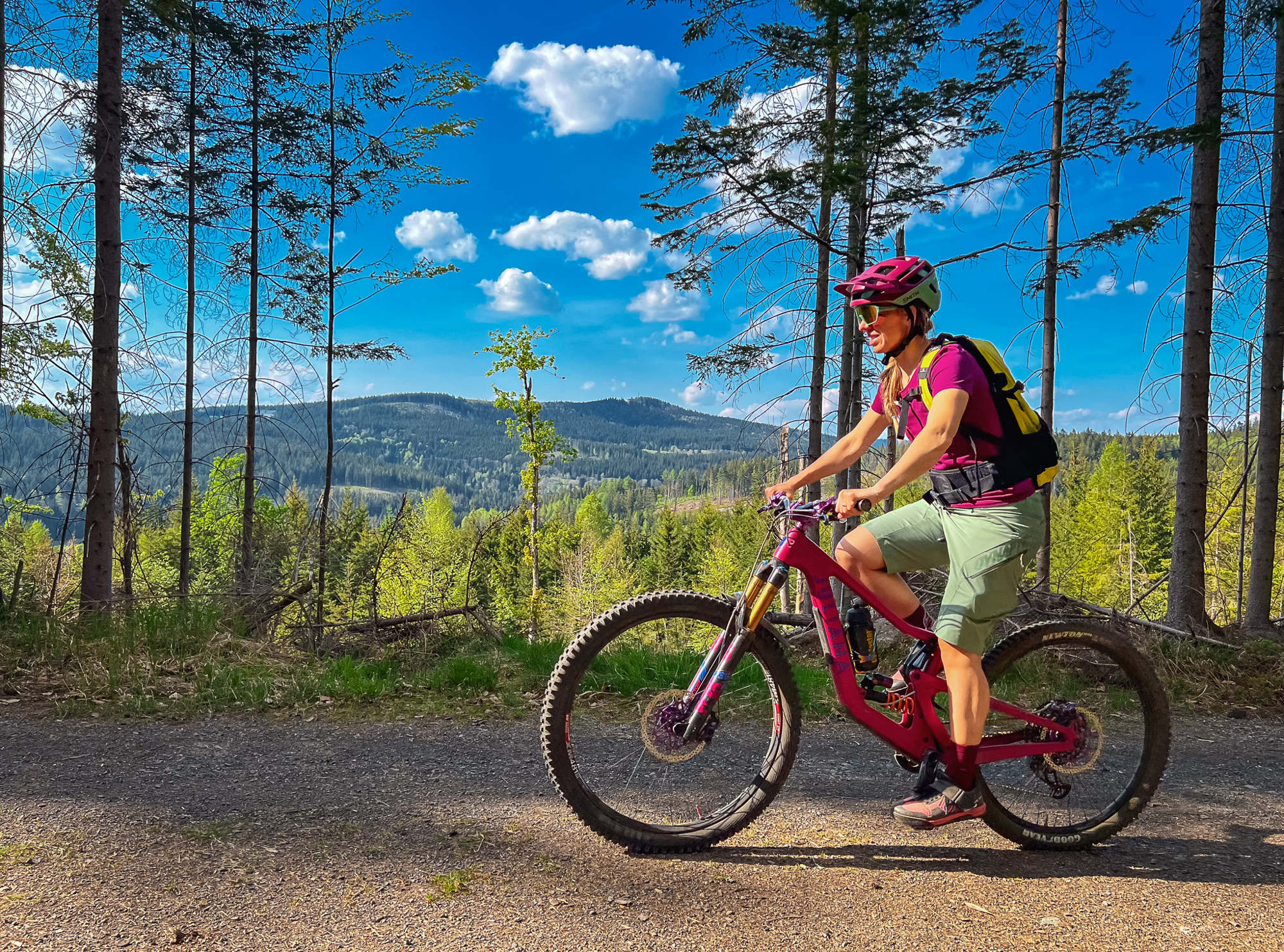 Na Špičáku jsme reportovali v helmách a brýlích značky SMITH, na e-biku STEVENS s pružením FOX, řetězem KMC a vložkami do kol TANNUS od firmy CYKLOŠVEC.