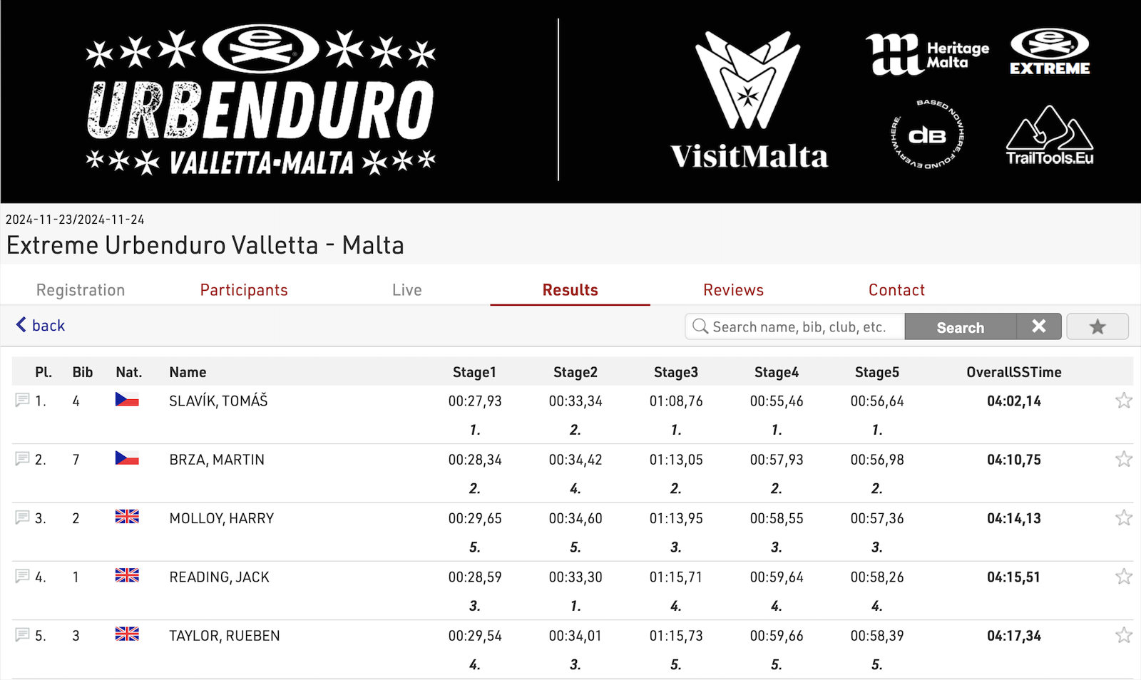 Závodníci startovali v pěti měřených úsecích - erzetách či stagích - vedoucích úzkými uličkami, schodištích i po umělých překážkách. Tomáš Slavík dokázal být nejrychlejší ve čtyřech z celkových pěti erzet a s osmivteřinovým náskokem před Brzou bral celkové vítězství na tomto premiérovém podniku na Maltě.