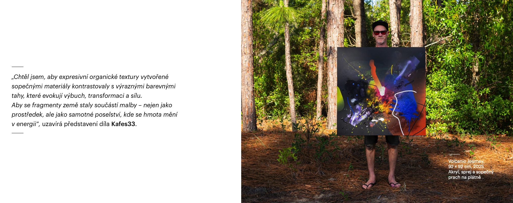 Spolu s nezapomenutelnými vzpomínkami si Gaspi z cesty přivezl neobvyklý suvenýr: pytlík se sopečným popelem. Tento syrový důkaz dávných erupcí se stal inspirací i základním prvkem nového uměleckého díla. Sopečný popel putoval do rukou českého umělce Martina Hirtha, známějšího pod pseudonymem Kafes33. Tento vizuální umělec, spisovatel a malíř patří k průkopníkům pražské graffiti scény. „Má svůj vlastní rukopis, typické křivky, tahy štětcem. Kdykoli chci, aby něco skutečně zazářilo, svěřím to jemu,“ říká Richard o spolupráci se svým dlouholetým přítelem a kolegou.