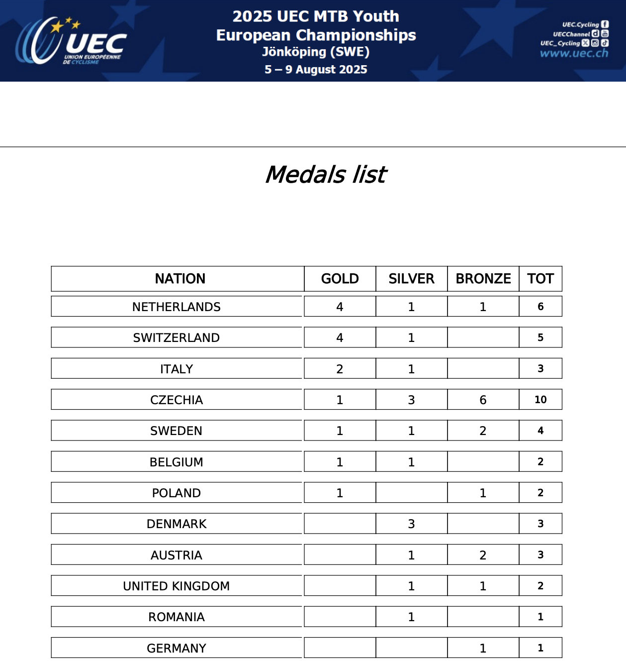 Rok 2025 přinesl další ročník Mistrovství Evropy horských kol mládeže UEC (kategorie do 15 a do 17 let), který se konal ve švédském Jönköpingu a dnes vyvrcholil závody cross country. Letos se ho zúčastnilo 719 dívek a chlapců z 28 zemí, včetně českých bikerek a bikerů, kteří ve Švédsku vybojovali celkem 10 medailí, nejvíce ze všech!