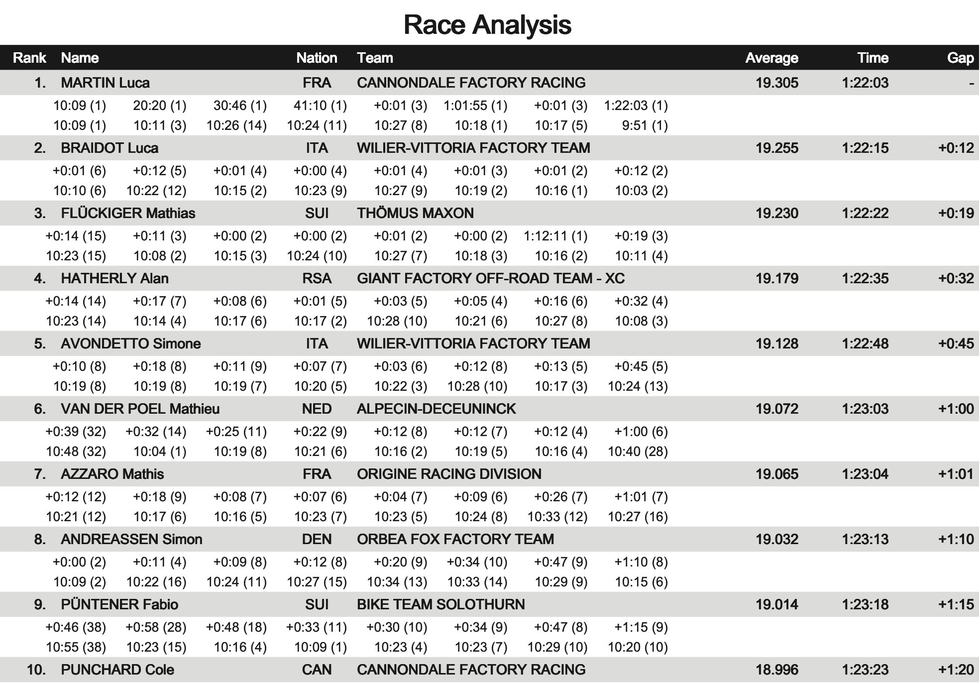 Van der Poel potvrdil, že jeho forma na horském kole je fantastická. Opatrnost byla v úvodu patrná, první kolo si více méně držel svou startovní pozici. „Myslím, že v prvním kole se pokazilo úplně všechno, co mohlo. Udělal jsem tam hodně chyb a pořád jsem byl za soupeři a nedokázal je předjet. To byla velká škoda. Potom jsem se vždycky dokázal dotáhnout na konec skupiny přede mnou, ale ve sjezdech jsem pořád ztrácel čas. A právě tam jsem dnes závod prohrál.“