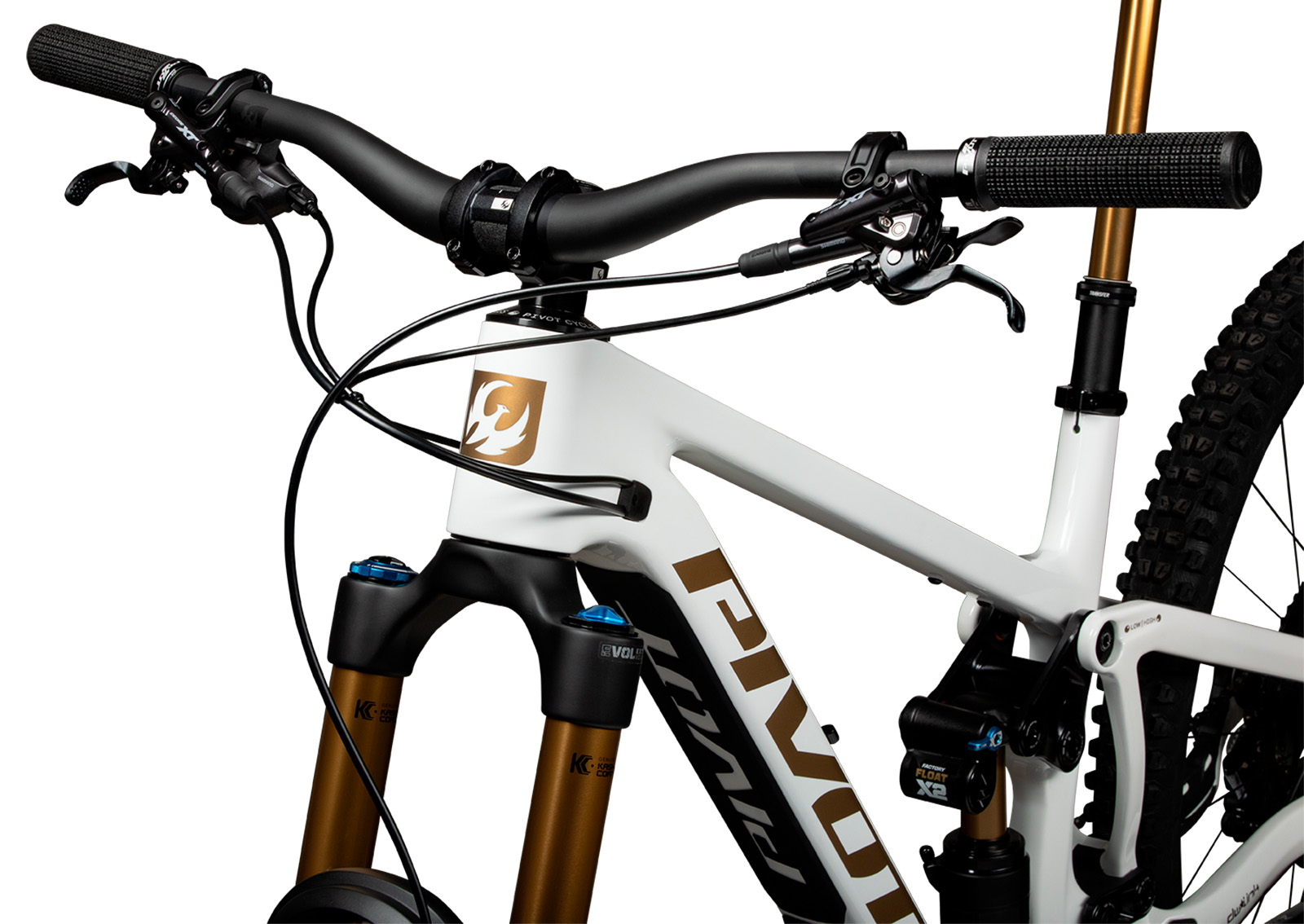 Firebird má nyní mohutnější, ještě tužší hlavovou partii, doplněnou o svá řídítka a představec. Řídítka Phoenix Team Carbon 35mm Rise Bar patří k tomu nejlepšímu, co je momentálně na trhu. Tlumí vibrace, ulevují rukám a přesně vedou stopu. Představec Phoenix Team Enduro V2 má mohutnější upínací část k dosažení požadované tuhosti. Má 7° zvednutí a je na velikostech Firebirdů osazen v délkách 32mm (XS), 40mm S-L) a 50mm (XL). Výsledkem synergie hlavy, představce a řídítek je bezkonkurenčně přesné řízení v těžkých sjezdech i vizuální souhra. Hlavové složení je 56mm ID (ZS56/ZS56).