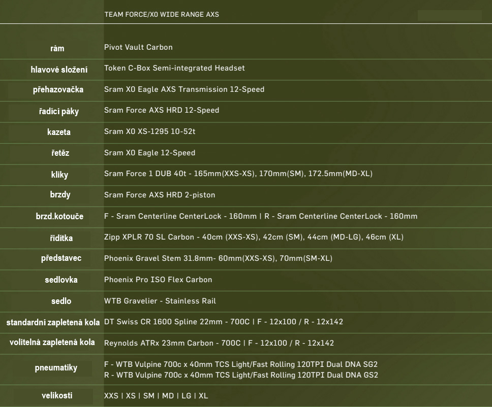 Shimano GRX u hladiny "RIDE". U sestavení "TEAM" jsou dvě varianty - Sram Force/X0 Transmission nebo Sram Force XPLR AXS s karbonovými výplety.