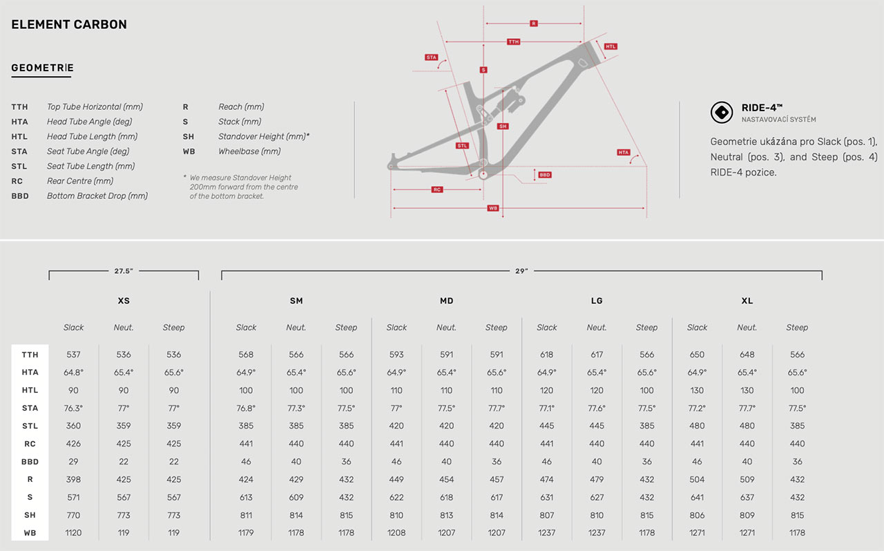 Pro model Element Rocky Mountain používá speciálně laděné tlumiče, pro maximálně aktivní hlavní část zdvihu a následnou progresi v jeho závěru. Kinematika i tvar zadního vahadla zde byla mezigeneračně kvůli flex pivotu mírně upravena, nicméně maxi univerzální flipchip, označovaný u této značky "RIDE-4" a umožňující měnit mírně geometrii kola hned ve čtyřech různých polohách, zde zůstal zachován.