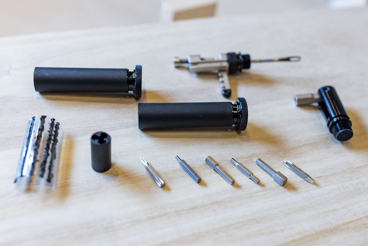 Jak už název Bartool napovídá, řeč bude o řídítkách, protože tohle nářadí je určeno právě pro ně. Mimochodem, tento koncept, kdy je tvar nářadí uzpůsoben do válcového tvaru o přesném průměru, který snadno zasunete dovnitř řídítek a jeho konec použijete jako zátku, není ničím novým. Před X lety s ním poprvé přišel Sahmurai se svou Sword opravnou sadou na defekty bezdušáků, kterou integroval právě do prodloužených plastových zátek řídítek. Od té doby se tento koncept ujal a postupem času stále více firem představuje různé, více či méně multifunkční nástroje určené do řídítek, které zvenčí zaznamenáte jen jako kovovou zátku řídítek, ale po jejich vysunutí na vás vykoukne různě koncipované příslušenství.