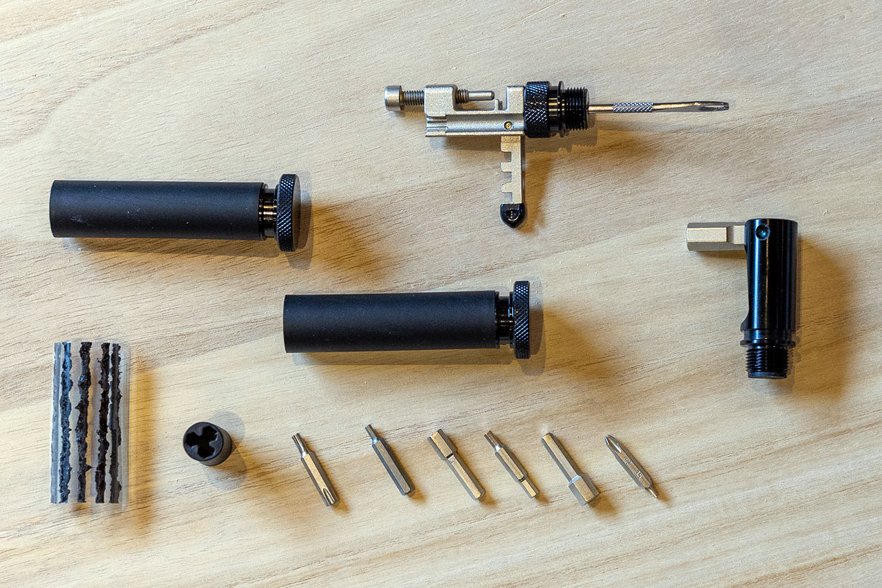 Tady ještě zmíním jeden zajímavý fakt, a to, že hlavní části nářadí včetně zakončovacích zátek jsou vyrobeny z hliníkové slitiny 6061, ale černé tubusy, uvnitř kterých jsou ukryty komponenty nářadí, ať už jde o sadu bitů v jedné, nebo sadu opravných knotů v druhé části nářadí jsou plastové.