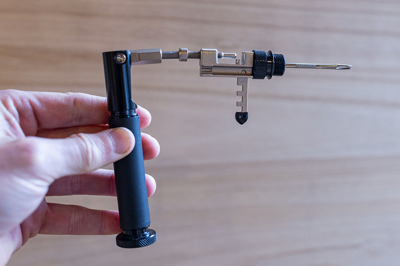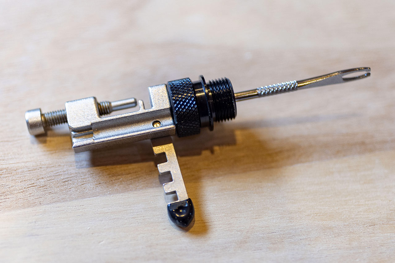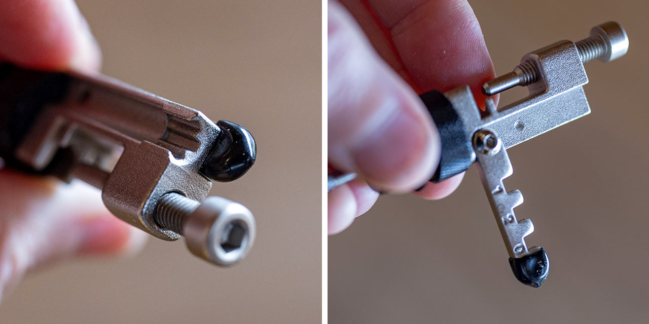 Nýtovač je zde minimalistický, koncipovaný klasicky tak, že v rámci jedné části multiklíče máte tělo nýtovače s nýtovacím imbusovým šroubem a druhou částí s nasazeným patřičným bitem zajistíte samotné nalisování a snýtování řetězu. Komfortem se to nedá srovnat s dílenskými nýtovači, vybavenými širšími opěrkami řetězu, ale v nouzi to myslím dokáže dostatečně posloužit.