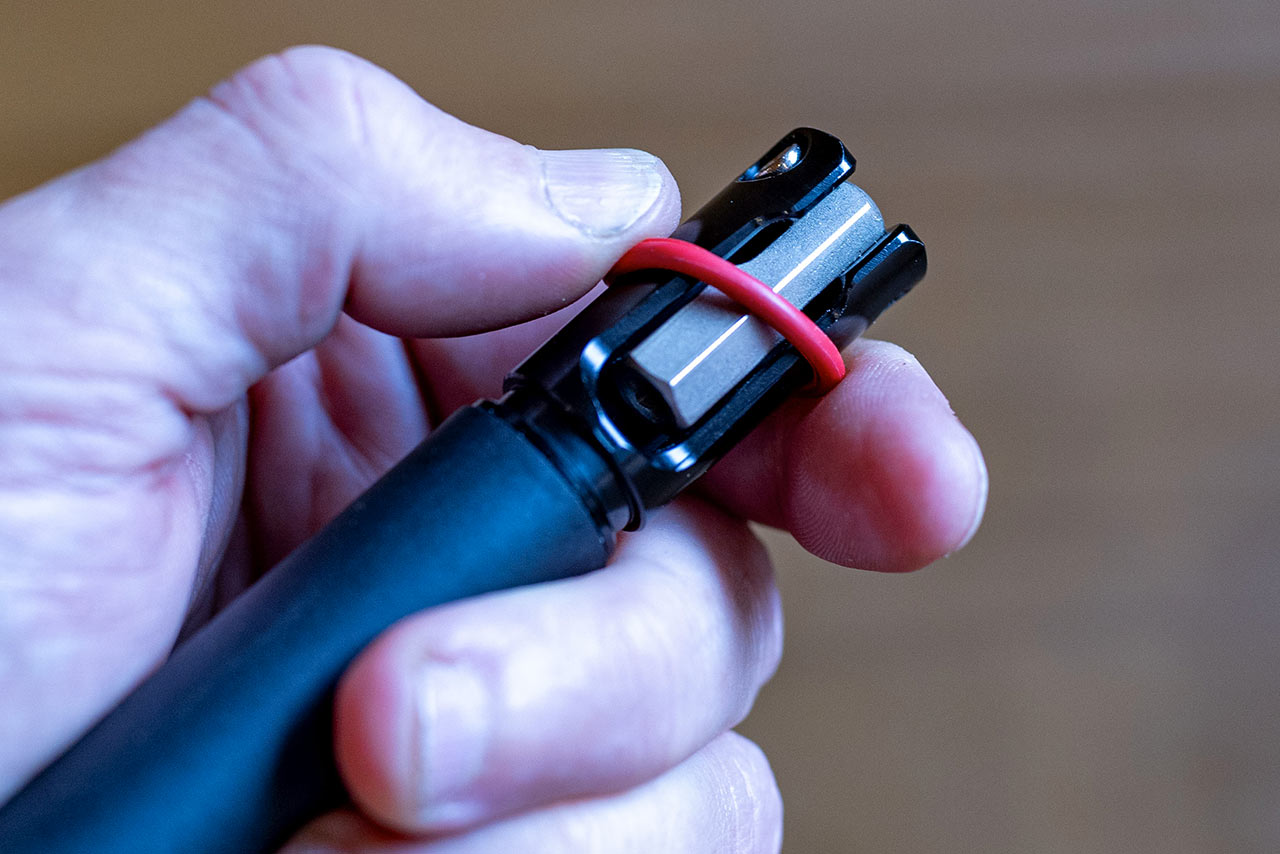 Jelikož je Bartool nářadí koncipováno do dvou částí, obsadíte jím oba konce řídítek, přičemž je jedno, jakou část kam dáte. Válcové tubusy jsou v obou případech osazeny vždy dvojicí drážek na začátku a konci, ve kterých jsou fixovány gumové "těsnící" kroužky, které drží obě poloviny nářadí v řídítkách. V balení standardně osazené červené silnější kroužky jsem v mém případě musel vyměnit za o něco subtilnější černé, ale to hravě zvládnete, pokud máte delší než krátké nehty, nebo s výměnou pomůže menší šroubováček.
