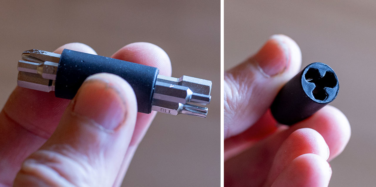 Ale zpátky k bitům a nářadí. Samotné bity jsou většinou kvůli úspoře místa oboustranné, ale právě proto je potřeba mít je uvnitř nářadí správně zastrčeny v držáku, protože jakmile dáte některý z bitů obráceně, nejen že vám v držáku nedrží, ale mohl by pak během jízdy uvnitř nářadí chrastit. Mně se podařilo takhle jednou špatně zandat bity, a když jsem je chtěl venku použít, odšrouboval jsem víčko a místo kompaktního držáku s šesti bity na mne dva z nich vypadly samostatně a několik minut mi pak trvalo je v trávě dohledat. Od té doby už jsem si na to dával pozor.