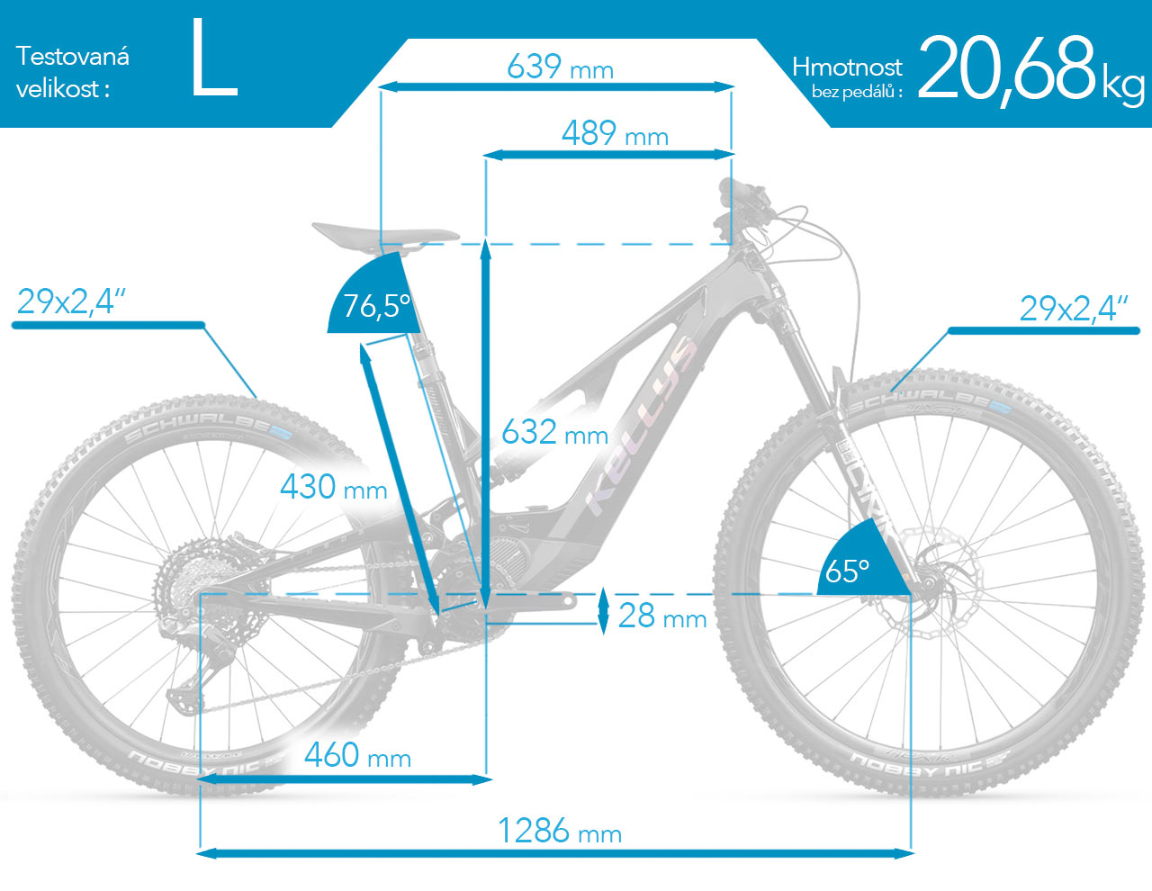 Testovaný bike jsme měli k dispozici ve větší ze dvou nabízených velikostí – L, přičemž jeho hmotnost bez pedálů jsme navážili 20,68 kg.
