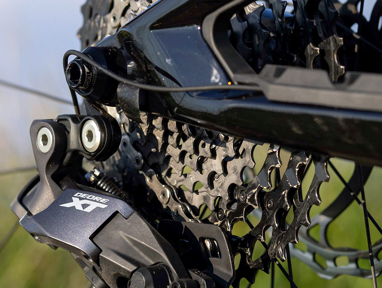 Když už jsem se zmínil o řazení, ještě to krátce rozvedu. Kellys se v tomto případě rozhodl použít zajímavou kombinaci klasického 1×12 systému doplněného o elektronickou verzi Shimano XT přehazovačky, napájené klasicky kabelem z hlavní baterie ebiku. Osobně s tímto nemám absolutně žádný problém, kromě toho, že zde není ideálně vyřešeno vedení kabelu od přehazovačky do zadní stavby a subtilní kablík v místě zadní patky tak nějak bez ladu a skladu plandá a říká si o zachycení větví a následné přerušení napájení přehazovačky.