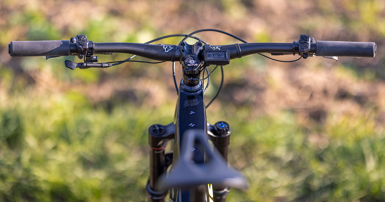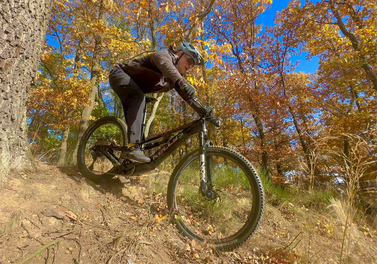 Pocitově je „efstovka“ lépe padnoucím bikem do ruky, co se týká manévrovatelnosti. Přišlo mi, jako bych seděl více mezi koly než nad nimi. Velký vliv na to má určitě hodně nízko umístěná horní rámová trubka, která sice nedává prostor umístit do rámu držák na láhev, (ten tak najdete na vrhu hotní rámovky), ale opticky i prakticky posouvá těžiště celého bajku směrem dolů, což je benefit, který oceníte v okamžiku, kdy s kolem potřebujete zatáčet, pokládat se do klopenek, rychle měnit směr nebo projíždět technicky náročnější pasáže, kde se vám hodí velký prostor pro manévrování koleny nad rámem. Mám rád nízké těžiště, jako mají například Specialized biky, a tady se to blížilo mému ideálu (nízký střed s vyšším úchopem).