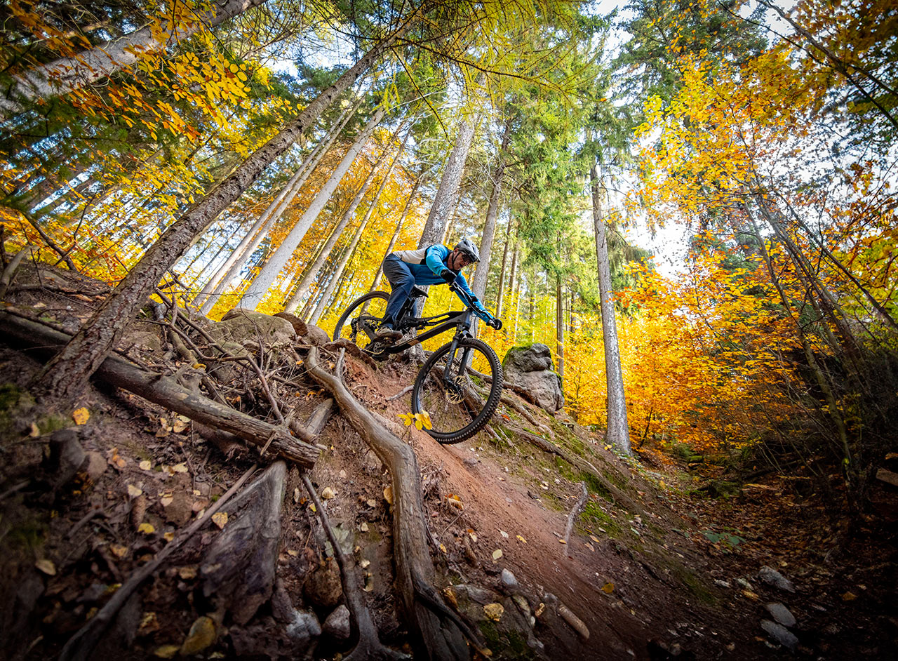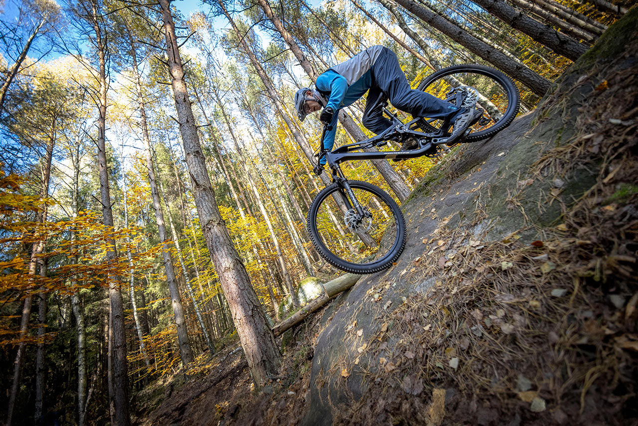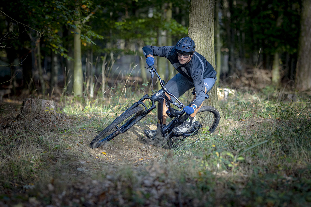 140 mm papírového zadního zdvihu bych biku netipoval. V praxi na mě zadní odpružení působilo, jako by mělo jít o 150-160 mm zdvih. Zatáčivost optimální, do manuálu se dá dostat poměrně snadno a v rychlejších rozbitějších kořenových pasážích jsem měl pocit, že za kratší konec tahá spíše vidlice než tlumič.
