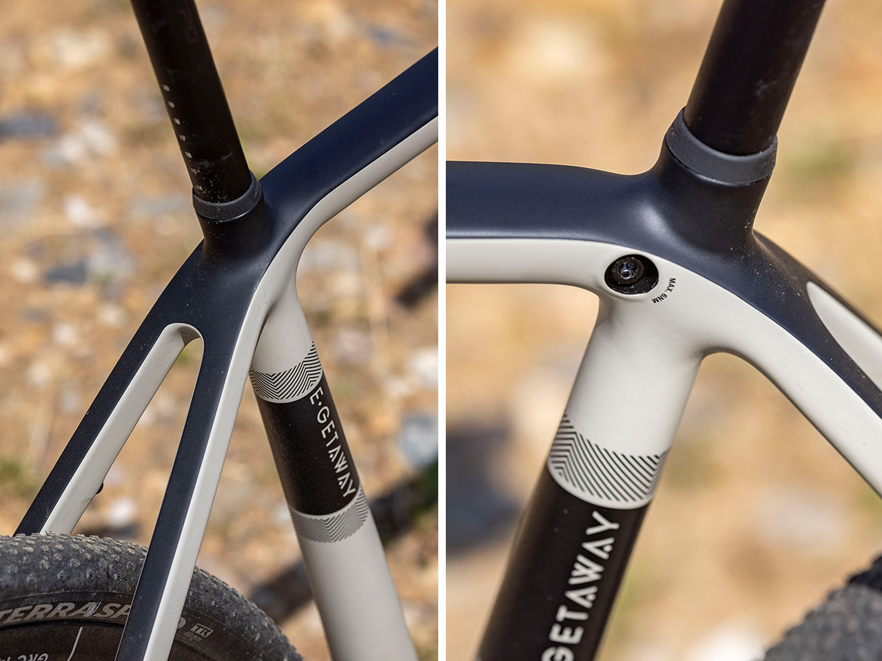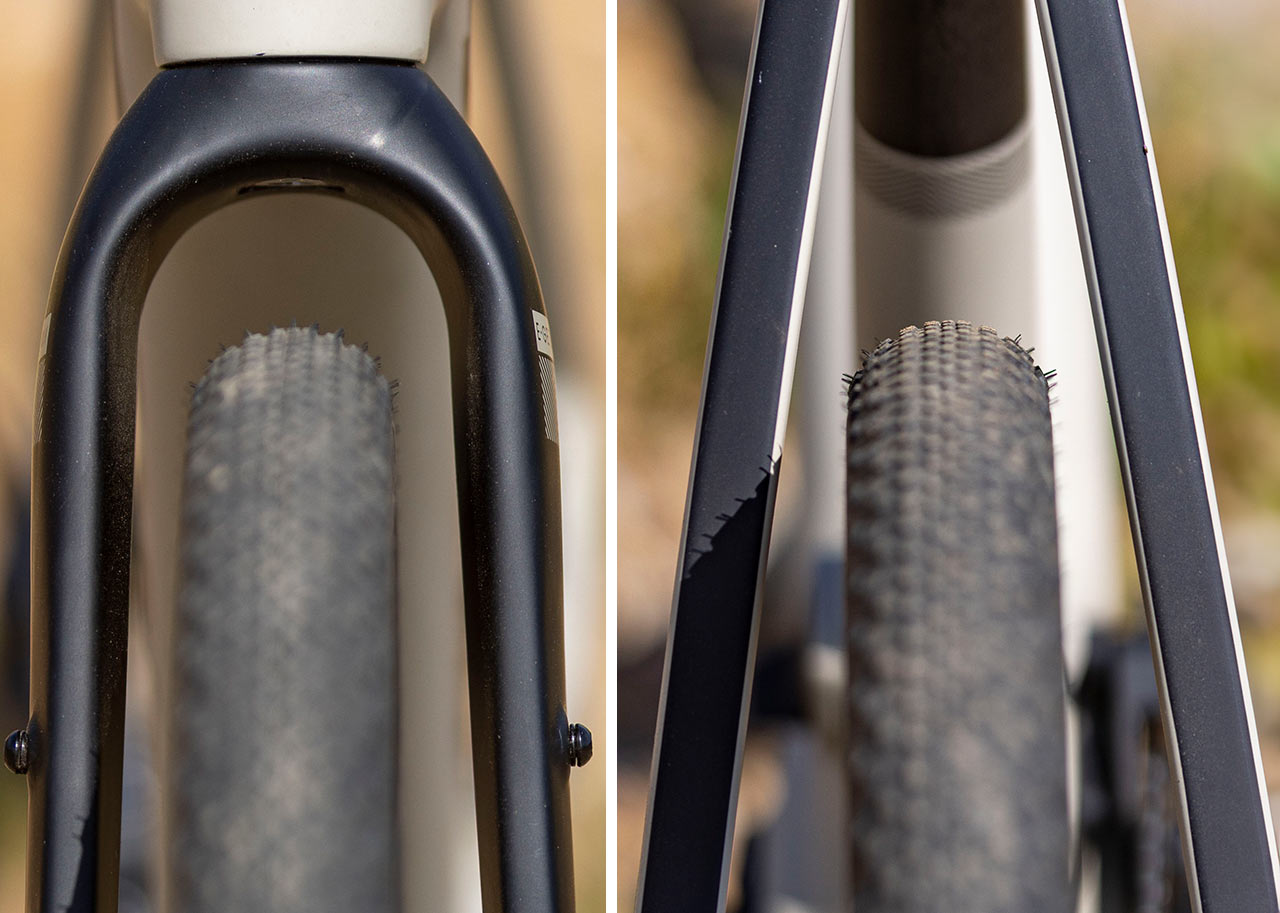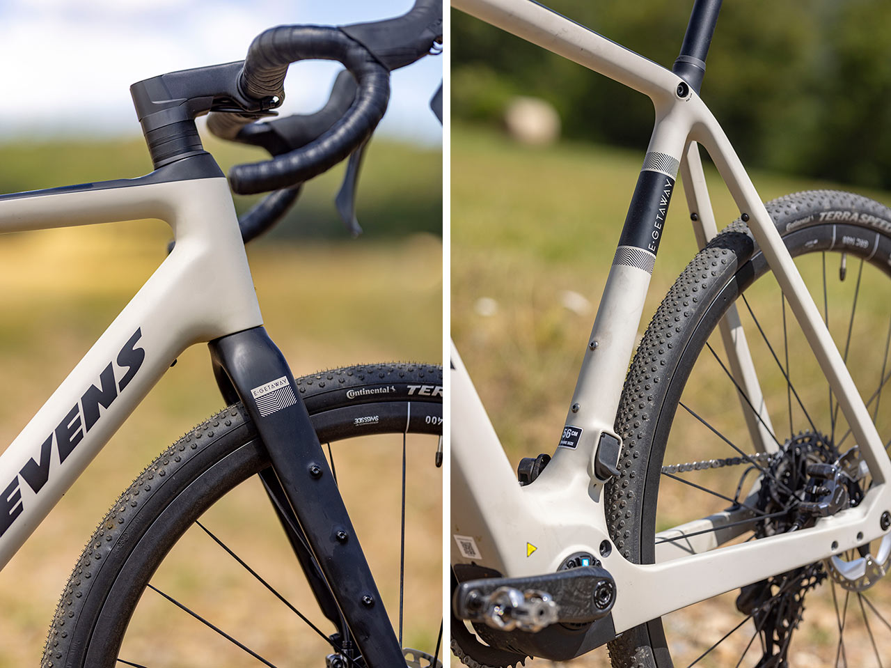 Nejenom robustní dolní rámová trubka, ale také robustní dolní vzpěry zadní stavby se starají o dostatečnou tuhost rámu, kterému pak sekundují poměrně úzké horní vzpěry zadní stavby, jejichž čtvercový průřez v celé jejich délce prozrazuje, že i tady se dbalo na tuhost a odolnost vůči větším silám, působícím na rám, ať již od samotného jezdce, nebo elekrického pohonu. Ohledně prostupnosti rámu a vidlice pro široké gravel pláště Stevens udává, že se sem vejdou maximálně pětačtyřicítky, ale troufám si tvrdit, že minimálně dopředu se vleze i 47, možná i 50mm plášť.