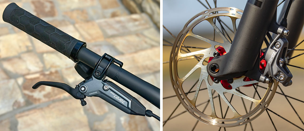 Úkol zastavit roztočená kola dostala dvojice brzd Sram Level Bronze pomocí 4 pístků a kotoučů o průměru 180 mm na obou kolech.